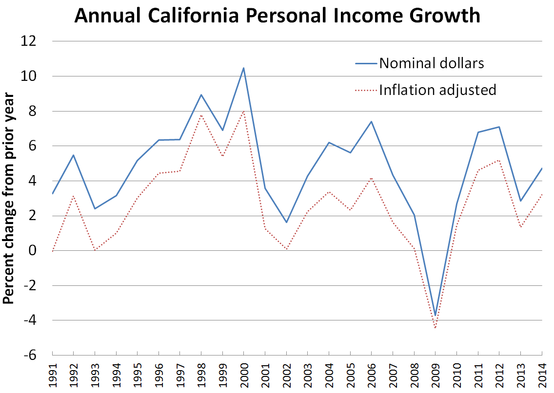 2014 Annual Growth Rate Good, But Below Late 1990s Levels. The figure below shows annual growth rates of California personal income since 1991, using the average level of personal income in the four quarters of each year. In 2014, according to the new BEA data, California "annual personal income" grew by 4.7% according to this measure, compared to 3.9% for the nation as a whole. The solid blue line in the figure below shows raw dollar amounts, and the dotted line shows inflation-adjusted amounts. The inflation-adjusted growth rate in 2014 was better than average although still well below the levels of the late 1990s technology boom.