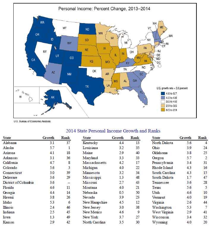 BEA State-by-State Comparison for 2014 Annual Personal Income Growth. Below is a BEA graphic comparing states in terms of annual personal income growth from 2013 to 2014. California ranked 8th highest among the 50 states by this measure in 2014, BEA said.