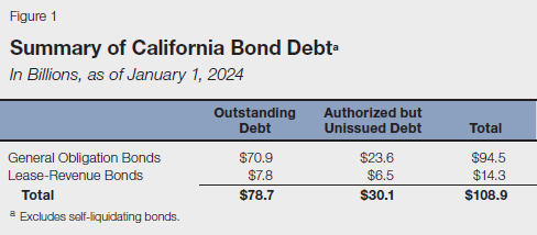 How Much Debt Does California Currently Have? As shown in Figure 1, California has a total of about $79 billion in outstanding bond debt—the vast majority of which is from GO bonds. In addition, the Legislature and voters have authorized another $30 billion in bonds that have not yet been issued (sold). As these bonds get issued in future years, they will increase the state’s outstanding debt. On the other hand, the debt that is currently outstanding will slowly get paid off, thereby reducing debt in future years. Over the last decade, outstanding debt has been paid off at roughly the same rate as new debt has been issued, resulting in a relatively steady level of state debt (not adjusting for inflation).