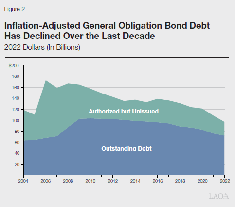 After adjusting for inflation, state GO bond debt—as well as authorized but unissued debt—has declined over the last decade, as shown in Figure 2. This decline followed a period in the mid-2000s when voters authorized several large bonds and, as a result, the state’s overall debt level increased significantly.