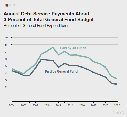 Debt service payments are sometimes evaluated as percentage of a state’s overall budget. This is sometimes known as the debt service ratio (DSR). As shown in Figure 4, total annual debt service in 2022-23 was about 3.2 percent of General Fund expenditures, but only about 2.5 percent when looking only at the portion of debt service payments that are paid from the General Fund. On both measures, the DSR was the lowest it had been over the last couple of decades.