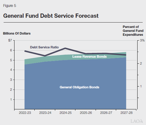 How Much Will Debt Service Payments Change Over the Next Few Years? We forecast modest growth in annual General Fund debt service payments over the next few years, as shown in Figure 5. Since the overall state budget is expected to grow during the same period, we project the DSR will remain relatively flat. This forecast does not assume debt service payments associated with Proposition 1, which will go before the voters in March. If Proposition 1 passes, we estimate the state would have about $100 million to $200 million in additional debt service payments by 2027-28—adding less than 0.1 percent to the state’s DSR. (Annual debt service payments would grow to over $400 million in the following years.)