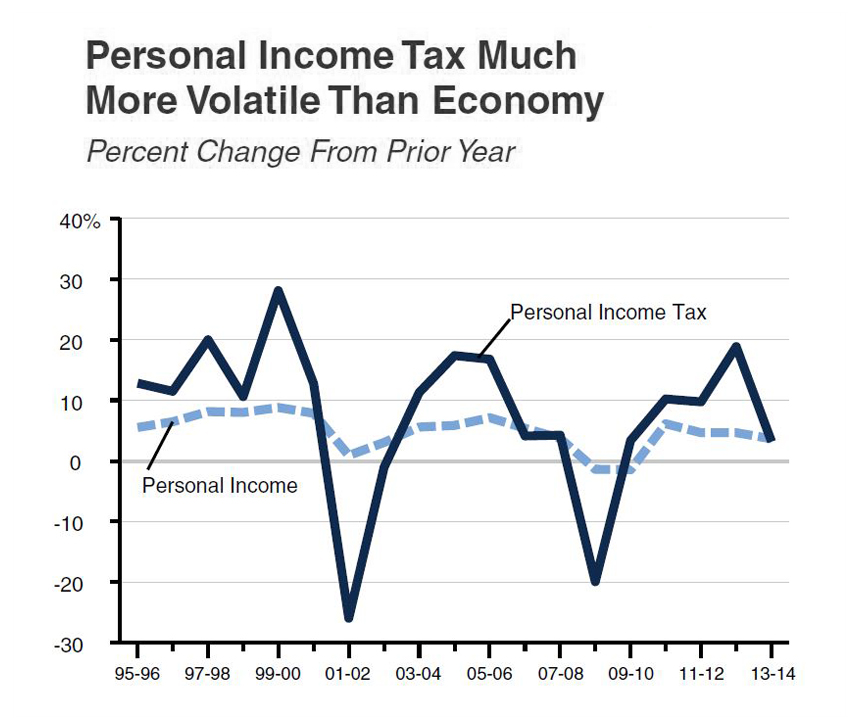 Why Is California's Personal Income Tax So Volatile? Personal income taxes are the largest state revenue source. As this graphic shows, these taxes are much more volatile than statewide personal income. This is partly because California taxes capital gains, which are especially volatile and mainly go to high-income taxpayers who pay the highest tax rates. These taxpayers’ other income also tends to be volatile.
