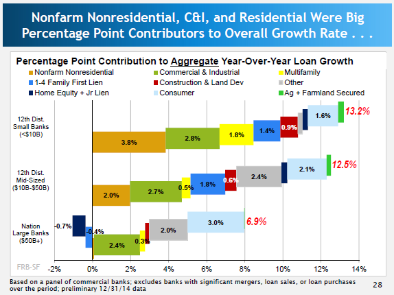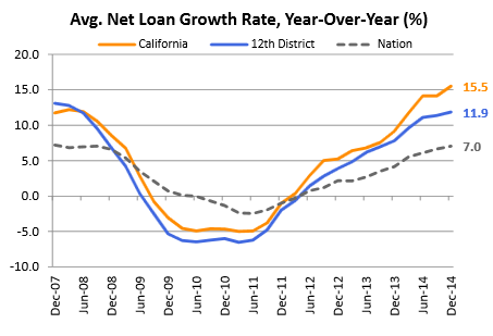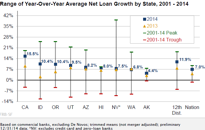 As shown below, bank lending growth in western (that is, 12th District) states, especially California, was stronger than the nation's overall 7.0% growth rate in 2014. California's growth rate for lending neared pre-recession peaks, the FRBSF reported.