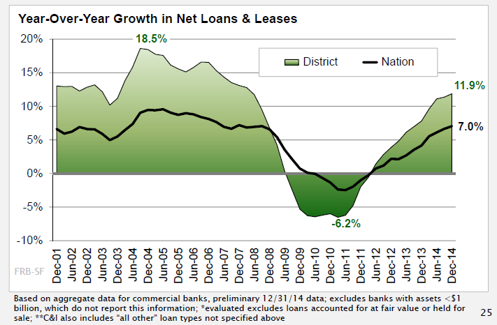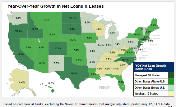 4Q2014 California Annual Loan Growth Rate Led All States But Connecticut. The FRBSF map shown below indicate that the 15.5% year-over-year growth rate in net loans and leases at commercial banks in California for the fourth quarter of 2014 ranked second in the nation, behind Connecticut's 16.6% growth rate.