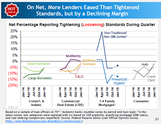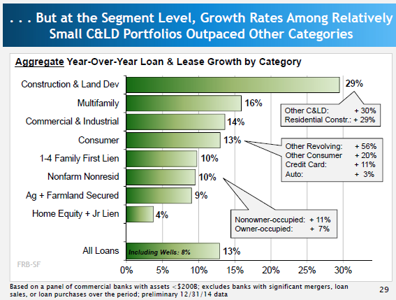 While construction and land development (C&LD) loan portfolios reportedly are relatively small in dollar terms, their percentage growth has outpaced other lending types, the FRBSF figure below shows. Lending for multifamily residential buildings grew by 16% year-over-year in the 4Q2014 data. By contrast, growth rates for consumer lending and first-lien single-family home loans have been relatively smaller.