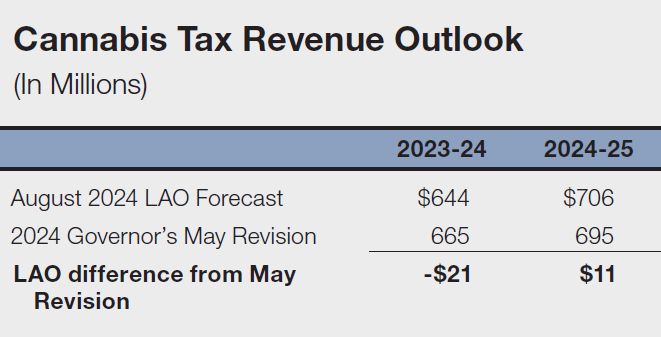 Current LAO Estimate for 2023-24: $644 Million. We currently project cannabis tax revenues of $644 million in 2023-24 and $706 million in 2024-25. As shown in the figure below, these estimates are similar to the revenues anticipated by the 2024-25 budget package, which used a forecast from the 2024 Governor’s May Revision.