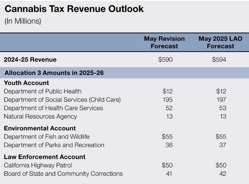 Current LAO Forecast for 2024-25: $594 Million. We currently project cannabis tax revenues of $594 million in 2024-25. This forecast is just $4 million above the administration’s May Revision forecast. As shown in the figure below, the resulting 2025-26 revenue allocations are nearly identical to the administration’s May projections.