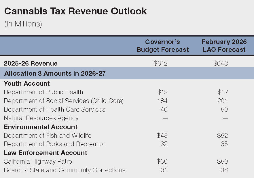 Current LAO Estimate for 2025-26: $648 Million. We currently project cannabis tax revenues of $648 million in 2025-26. This is $36 million above the January Governor’s Budget forecast for 2025-26. As shown in the figure below, the resulting 2026-27 revenue allocations are somewhat higher than the administration’s January projections. Looking further ahead, our preliminary revenue projection for 2026-27 is $661 million, which is $63 million above the administration’s January forecast.