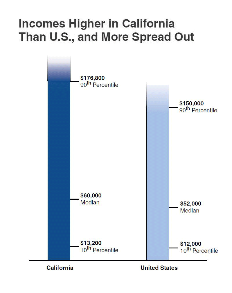 • Gap Between High-Income and Very Low-Income Households Also Greater. As shown above, the gap between high–income households (for example, the 90th percentile of households by income) and very low–income households (such as those at the 10th percentile) is greater in California than in the U.S. as a whole.