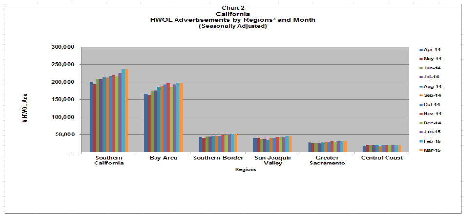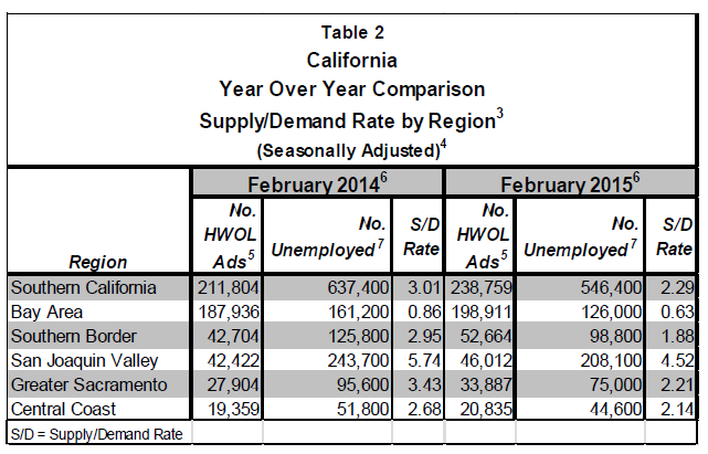 California showed year-over-year improvement from February 2014 to February 2015 with all regions experiencing a "proportional increase in advertisements," with "fewer unemployed individuals for every online advertised vacancy for February 2014 than there were for February 2015," as shown below.