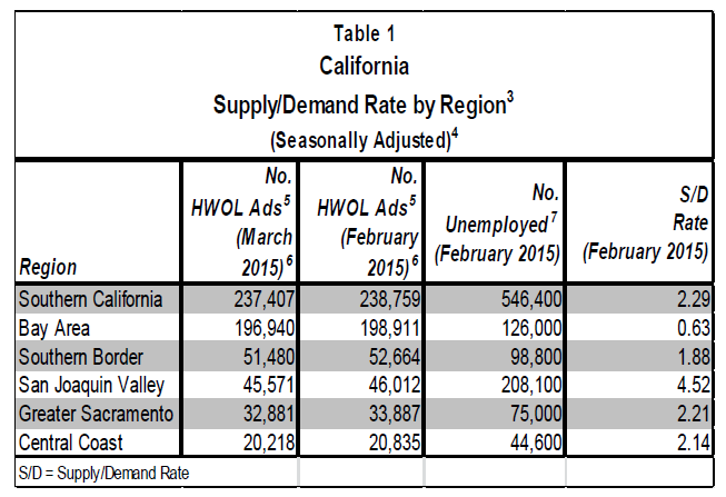"Supply/Demand Rate." The EDD report calculates a supply/demand (S/D) rate by region, considering the number of unemployed (a measure supply of available workers) versus the number of help-wanted online ads (a measure of demand for workers). Using February 2015 data, the national seasonally-adjusted supply/demand rate was reported to be 1.60, versus a seasonally-adjusted rate for all of California at 2.04. "The different regions within California vary in their supply/demand rate with all regions above the national level except for the Bay Area," the March report notes. The EDD figure below breaks California's supply/demand rate into six regions. The San Joaquin Valley has the highest supply/demand rate among California's regions tracked with roughly five unemployed people for every advertised vacancy, EDD found.