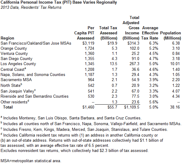 The Inland Empire, the San Joaquin Valley, and the North State region have per capita PIT and average PIT tax rates that are well below the statewide averages. In general, this results from comparatively lower income levels in those regions.