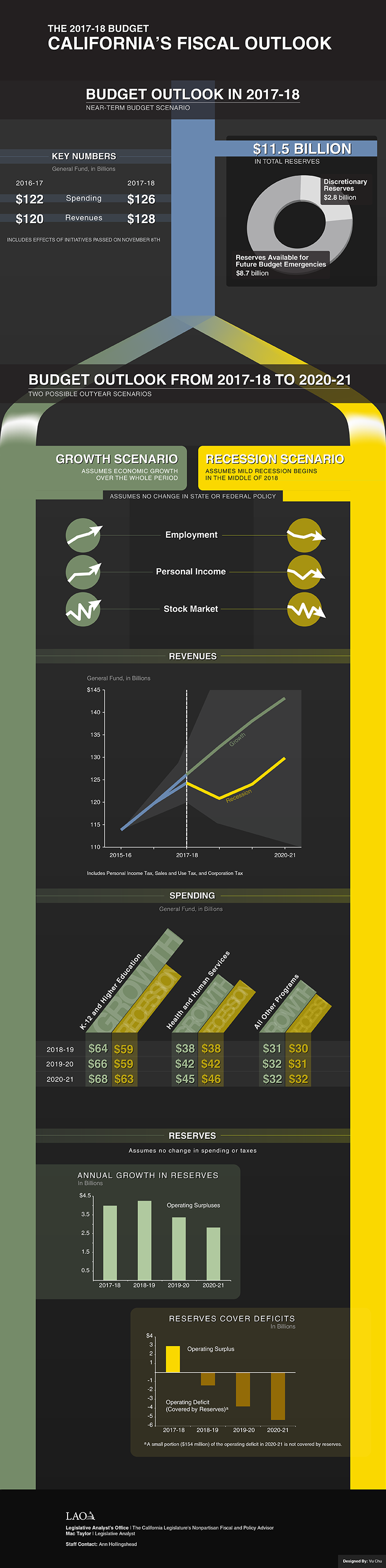 With this year’s Fiscal Outlook, we include an infographic that illustrates the main themes of the report. The infographic displays our assessment of the California state budget in 2017-18, as well as two possible future scenarios for the economy and budget.