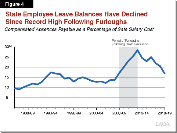 Before Pandemic, Leave Balances Were Declining. The state reports its leave balance liabilities as “compensated absences payable” in its Annual Comprehensive Financial Report. Figure 4shows that the state’s leave balances (measured as compensated absences payable as a percentage of state salary costs) were decreasing from their high point following the end of the furlough programs in 2012‑13. This decline likely is attributable to new leave buyback programs and increased levels of retirements. In 2018‑19, the total reported liability for leave balances was $3.9 billion.