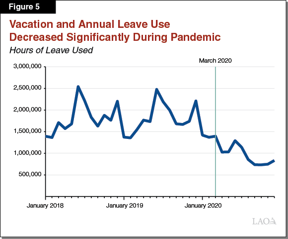 Rank-and-File Vacation and Annual Leave Use Decreased Significantly During Pandemic. State employees receive many different types of leave. Of the different types of compensable leave, vacation and annual leave are by far the largest. Vacation and annual leave can be used for any purpose. As Figure 5 shows, state employees used significantly fewer hours of vacation and annual leave beginning in March 2020.