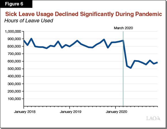 Rank-and-File Sick Leave Usage Decreased Significantly During Pandemic. Sick leave is a non-compensable type of leave. That is, it cannot be cashed out. However, it can be converted to service credit for purposes of calculating an employee’s pension upon retirement. Sick leave has restricted uses and generally can only be used for medical reasons—either related to medical care for the employee or for the employee to care for a family member. As Figure 6 shows, the number of hours of sick leave used by state employees dropped precipitously in March 2020.