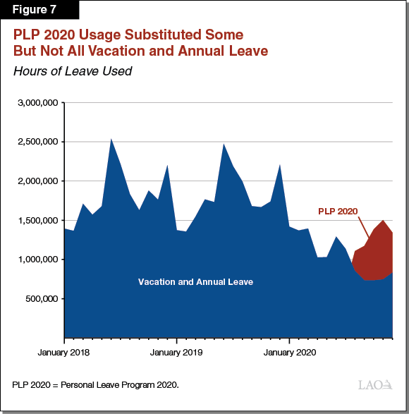 Significant Share of PLP 2020 Leave Received by Rank-and-File State Employees Not Used by December 2020. According to the administration’s policy, PLP 2020 is compensable and “may be cashed out upon separation from state service.” The most recent data available to us on leave balances reflects leave balances as of December 2020. By December 2020, rank-and-file state employees had used 1.3 million hours of PLP 2020, but had leave balances of unused PLP 2020 totaling 7.8 million hours. The administration’s policy of PLP 2020 use specifies that “where feasible, PLP 2020 should be used in the pay period it was earned.” At least in the first six months of PLP 2020, it seems that employees typically did not use PLP 2020 in the month it was received.