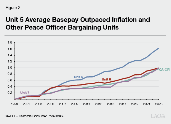 Automatic Formula Has Resulted in CHP Officer Salaries Rising Faster Than Other State Peace Officers and Inflation. Figure 2 compares the growth in average base salary for Units 5, 6 (Corrections), and 7 (Protective Services and Public Safety) with the growth in inflation (measured by the California Consumer Price Index [CA-CPI]) since 1999. The three bargaining units each represent peace officer classifications. As the figure shows, Unit 7 average base pay roughly kept pace with inflation over the past two and a half decades. As we discussed in the 2007-08 Budget: Perspectives and Issues, the 2001 MOU for Unit 6 briefly tied Unit 6 salaries to Unit 5 salaries between 2001 and 2006—this parity can be seen in the figure as Unit 6 average base pay growth very closely followed growth in Unit 5 average base pay during that period. After Unit 6 salaries were decoupled from Unit 5 salaries in 2006, the salary growth moderated and today is in line with inflation growth. In contrast, after 2006, Unit 5 average base pay continued to grow much faster than inflation. While the counter factual cannot be known, Unit 5 pay may have been closer to the increases provided to other peace officers if the automatic pay formula had not been not in effect.