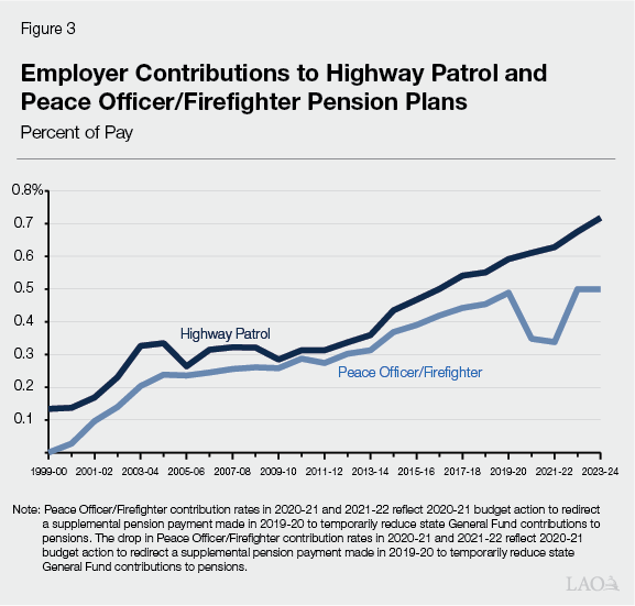 Highway Patrol Pension Employer Contribution Rates Have Grown More Than for Other Peace Officers. Figure 3 shows that the state’s contributions to fund the Highway Patrol pension plan have increased more than its contributions towards the POFF pension earned by other state peace officers. The difference in growth likely is due to a combination of the higher volatility of the Highway Patrol plan, the pay increases received by Unit 5, and the effects of the Proposition 2 SPPs that have benefited POFF but not Highway Patrol. CalPERS projects that the state’s contribution to the Highway Patrol plan will increase by an additional 2 percent of pay by 2029-30. Depending on how actual experience between now and 2029-30 deviates from actuarial assumptions (for example, investment returns), the state’s contribution could be higher or lower than currently projected.