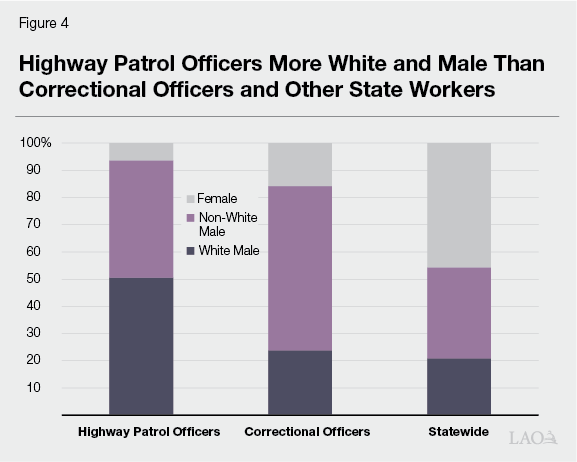Unit 5 More Likely to Be White and Male… Peace officer jobs—like CHP officers—historically have been filled by men. As Figure 4 shows, CHP officers are less diverse than correctional officers or the statewide civil service workforce. Specifically, more than 90 percent of CHP officers are male and about one-half of CHP officers are both male and white. In contrast, correctional officers proportionately have nearly three-times the representation of women among their ranks and have a significantly larger share of non-white men. The lack of gender and ethnic/racial diversity among CHP officers means that the state’s police force that regularly interacts with the public is not representative of the public. However, the trend seems to be moving towards CHP officers becoming more diverse. For example, the share of CHP officers who are white and male has decreased from 61 percent in 2017 to 51 percent in 2024. Further, in 2024, only 20 percent of CHP cadets were identified as white and male. Higher levels of diversity among graduating cadets will lead to higher levels of diversity among CHP officers in future years.