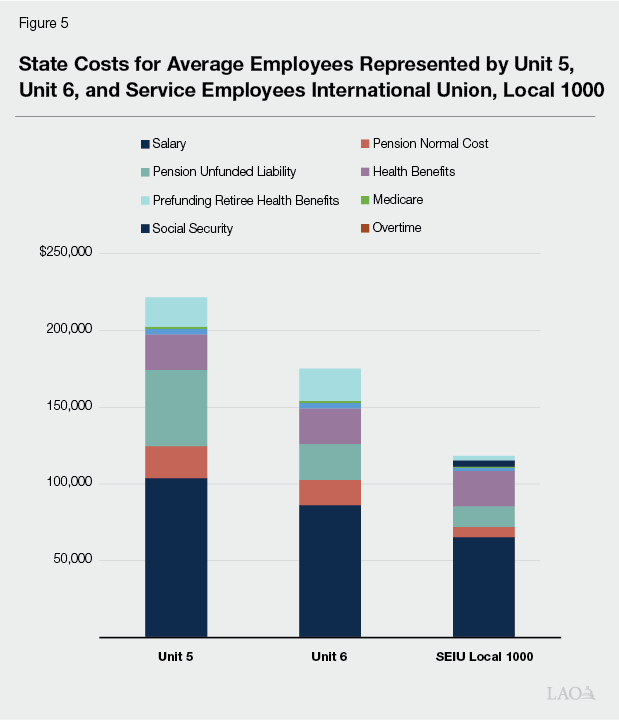 …And Compensated More. While there are classifications that receive significantly higher levels of compensation than CHP officers, Bargaining Unit 5 is the highest compensated state peace officer bargaining unit and is among the higher paid bargaining units overall statewide. Figure 5 shows that the state’s costs to compensate CHP officers is greater than for state correctional officers and roughly twice the cost for the state employees represented by Service Employees International Union, Local 1000 (SEIU Local 1000)—a union that represents roughly one-half of rank-and-file state employees. While the jobs performed by employees represented by SEIU Local 1000 and CHP officers are dramatically different, the comparison helps put CHP officer compensation into the context of the “typical” state employee. Comparing Unit 6 with Unit 5 allows for a comparison between peace officer classifications. As the figure shows, total compensation costs for Unit 5 is significantly larger than Unit 6, but this is driven in large part by the state’s payment to pension unfunded liabilities rather than significant differences in take home pay.