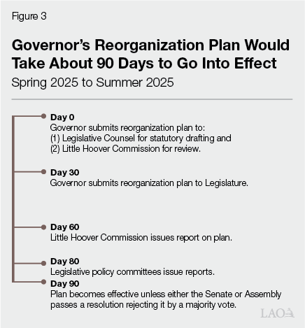 Proposes to Pursue Reorganization Through Executive Branch Process. The Governor’s Budget Summary indicates the administration intends to write a reorganization plan and submit it to the Little Hoover Commission by spring 2025. The administration then intends to forward the plan to the Legislature 30 days later. Figure 3 shows the time line based on our discussions with the administration and current law.