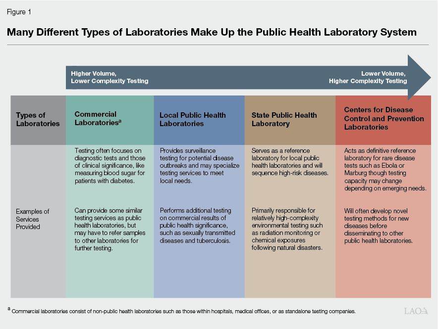 Public Health Laboratory System Includes Many Public and Other Entities. The public health laboratory system is made up of federal, state, local, and commercial laboratories that each perform different testing services at varying levels of complexity and volume. (Commercial laboratories are other entities that are not designated as public health laboratories, but perform testing services that inform public health testing.) Figure 1 describes, at a high level, the role of the different types of laboratories that provide testing services for the state’s public health system.