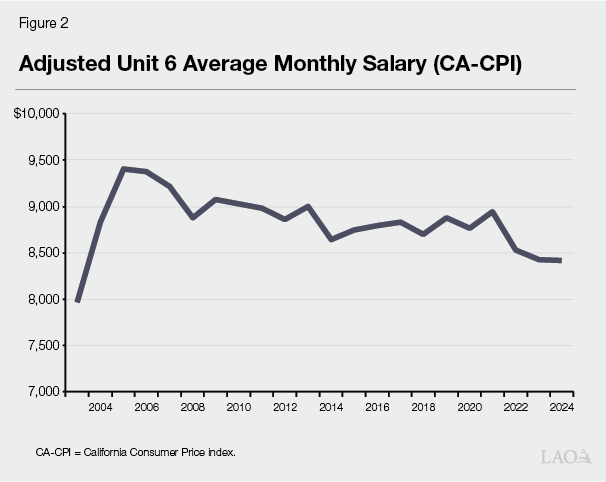 Unit 6 Base Pay Has Not Kept Pace With Inflation, but Remains Above 2003 Levels. As we discussed in our 2008 analysis, CDCR experienced high vacancies and recruitment challenges for correctional officers in the early 2000s that were addressed through operational changes as well as significant increases to correctional officer compensation provided by the Unit 6 MOU that was in effect from 2001 to 2006. In 2008, we indicated that “the job of state correctional officer may now be the most sought after in the California economy” thanks to the increase in compensation. Controlling for inflation, Figure 2 shows that average Unit 6 base pay increased by 18 percent between 2003 and 2006 under the terms of the 2001-06 MOU. (We note that average monthly base pay is an imperfect metric to gauge effects of inflation as it reflects growth in salary from salary increases as well as seniority as people move up their job classification’s salary range.) Since 2006, inflation has eroded the average Unit 6 base pay such that the average real monthly base pay in 2024 was almost 11 percent lower than it was in 2006. However, average real base pay remains 6 percent higher than it was in 2003 when the state last experienced significant challenges recruiting correctional officers.