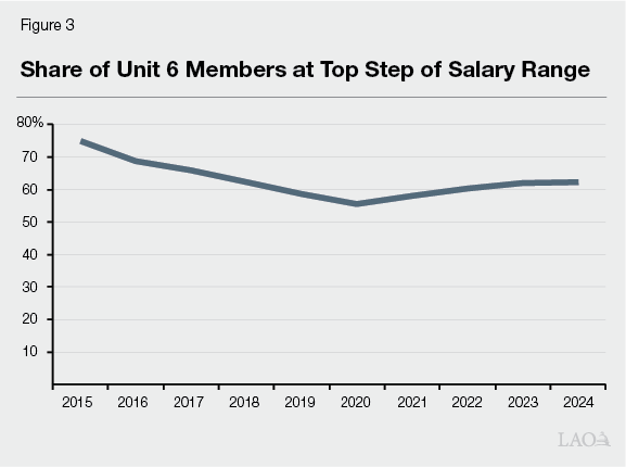 Somewhat Lower Share of Employees at Top Step. As Figure 3 shows, compared with 2015, a lower proportion of Unit 6 members are paid at the top step of their salary range. This indicates that there is less seniority among Unit 6 members than a decade ago. However, share of Unit 6 members at the top step has grown since 2020, suggesting that there is not a drain of seniority among Unit 6 members.