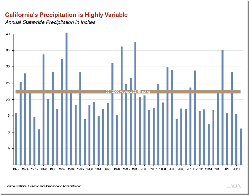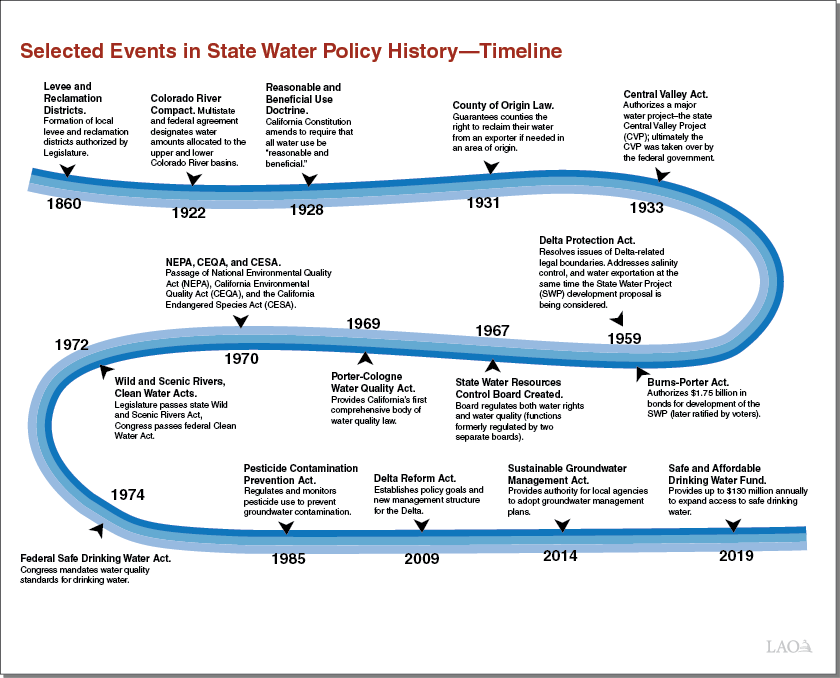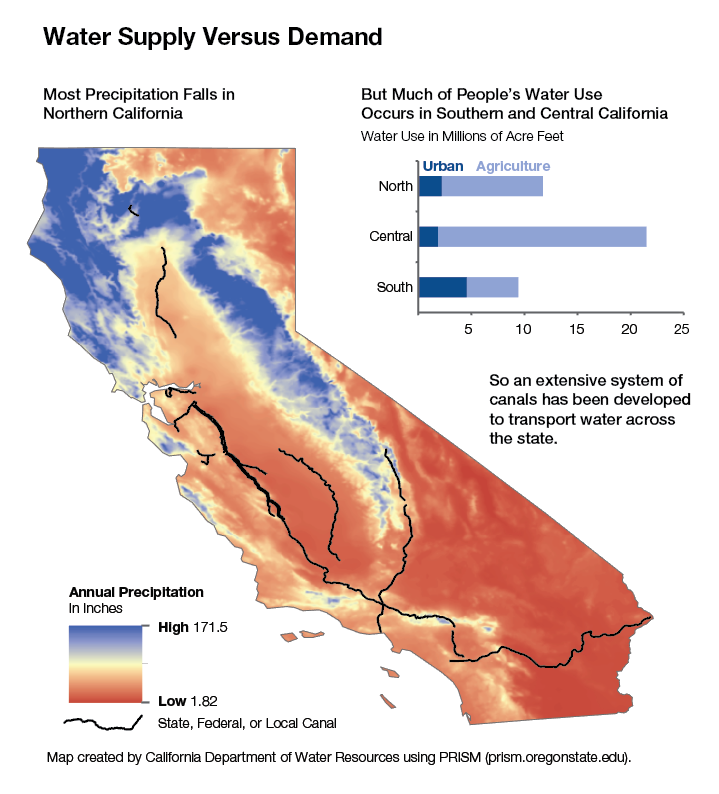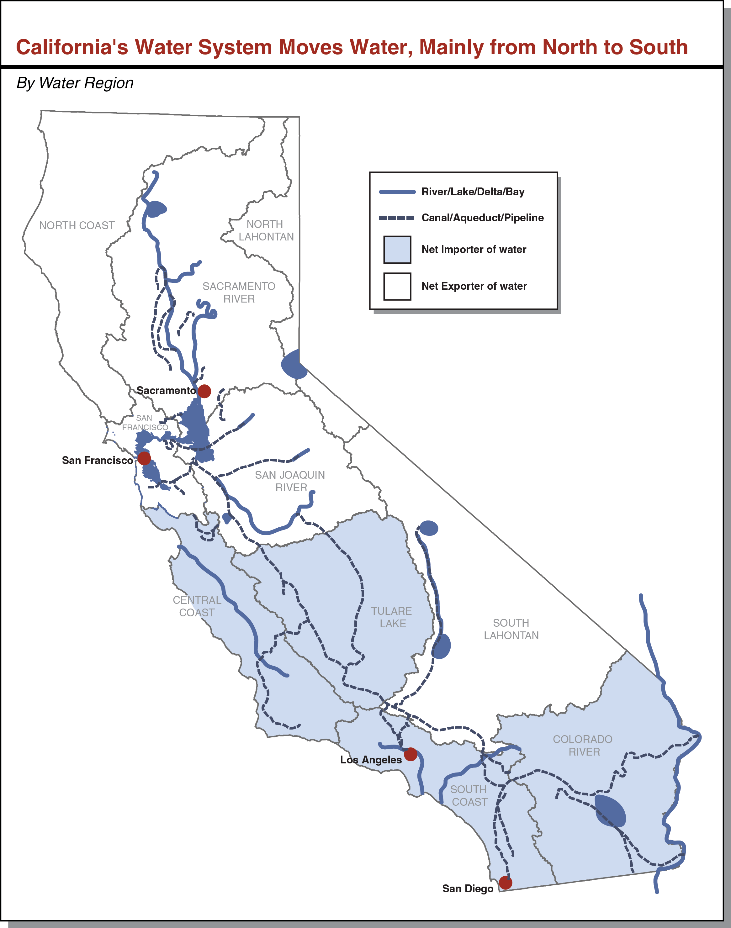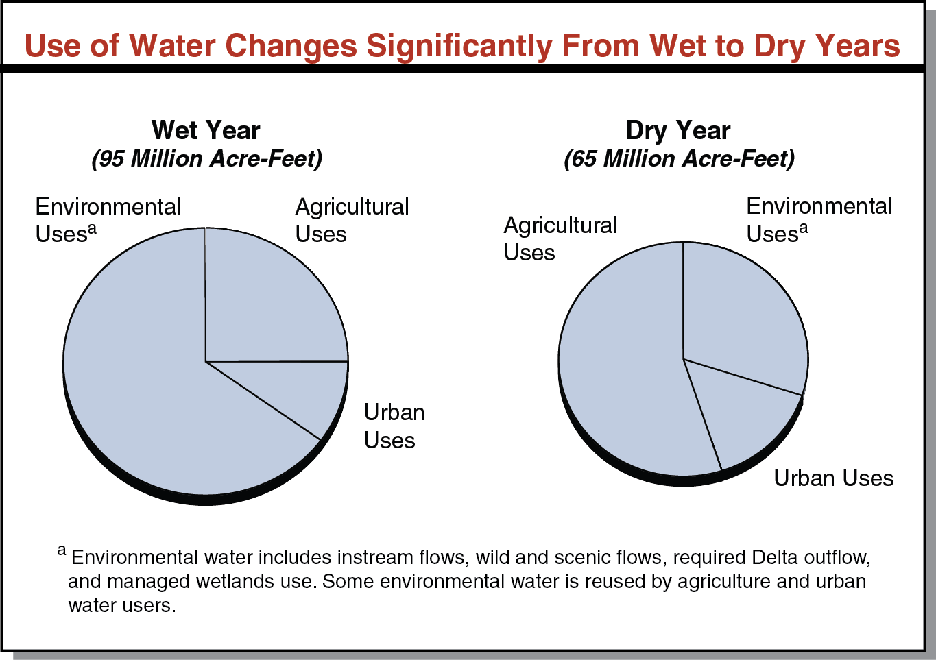California’s water system is complex. This complexity can be seen in how the system is structured—with multiple sources of water that are interconnected in various ways. It is also evident in how the system is financed—using a variety of sources at the local, state, and federal level to meet the needs of urban and agricultural water users and the environment. This web page provides some "quick reference" tables and graphics that illustrate some key elements of California's water system.