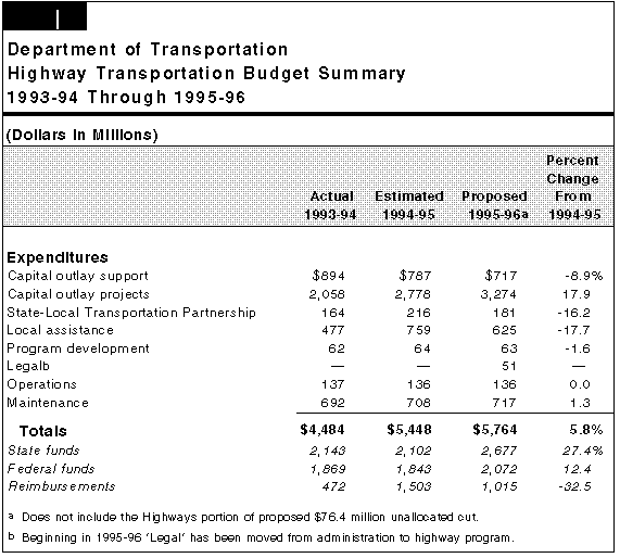 Of the total expenditures proposed in the department's budget, $5.8 billion is for the Highway Transportation program. This is an increase of $316 million, or 5.8 percent, over estimated current-year expenditures.