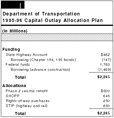 Allocation Plan Will Ration Funds for New Projects. As we discussed in the Crosscutting Issues section of this chapter, there is a significant funding shortfall in the state's transportation program. Due to this shortfall, Caltrans projects that in 1995-96 it will have insufficient capital outlay funds to construct all of the projects, including seismic retrofit, that are scheduled for delivery in that period. As a result, Caltrans is in the process of developing an allocation plan to maximize capital outlay funds and to ration these funds among all of the projects that are scheduled for delivery. The allocation plan will address the 18-month period from January 1995 through June 1996.