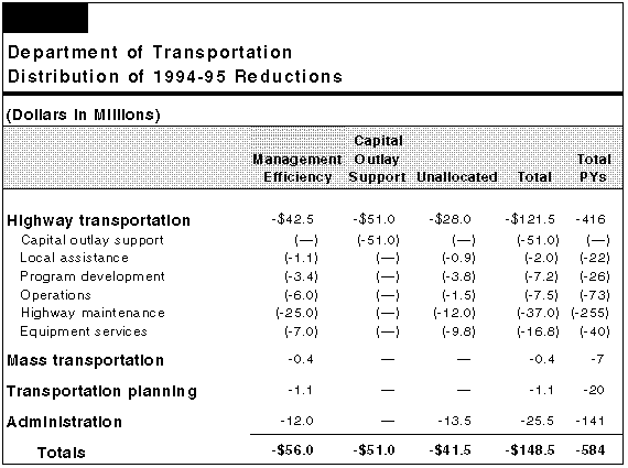 In the current year, Caltrans has to make substantial reductions in some of its programs below their 1993-94 level. This is because the 1994-95 budget includes the following actions: