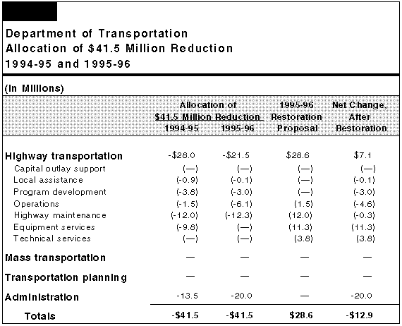 Budget Reallocates $41.5 Million Reduction. In preparing its 1995-96 budget, Caltrans chose to reallocate the $41.5 million reduction such that the reductions will affect program funding in a different way compared to the current year. Figure 7 illustrates how the reductions were allocated in 1994-95 and how the department reports that it will reallocate the cuts in 1995-96. Specifically, reductions to highway maintenance will continue in 1995-96, at about the same amount as the current year, but administration will bear a greater share of the cut--$20 million in 1995-96, compared to $13.5 million in 1994-95. In total, the entire highway transportation program would bear $21.5 million of the cut, compared to $28 million in the current year.