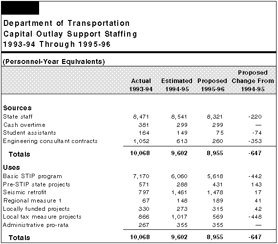 We further recommend that Caltrans justify its proposed level of contracting out (260 PYEs) in terms of continuing and new contracts, and technical specialities, in view of recent court rulings that limit Caltrans' ability to continue to contract out. The budget proposes expenditures of $717 million for highway capital outlay support in 1995-96. This is a reduction of $71.4 million (9 percent) from estimated current-year expenditures. This expenditure level will support a total of 8,955 PYEs of work--a decrease of 647 (6.7 percent) from the amount estimated in the current year. Capital outlay support staff provide engineering, right-of-way acquisition, environmental clearance, technical support, and construction oversight on capital improvements. Figure 8 illustrates both the source of the 8,955 capital outlay support PYEs, as well as Caltrans' proposed use for the PYEs. In order to achieve a reduction totaling 647 PYEs, Caltrans proposes to reduce state staff by 220 PYs, contracting out by 353 PYEs, and student assistants by 74 PYEs.