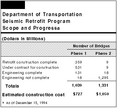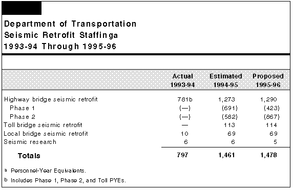 Although the department did not meet its latest deadline, delivery of Phase 1 seismic retrofit is almost complete. Phase 2 retrofit is in the early stages of engineering. The department's staffing and delivery schedule for Phase 2 are only preliminary estimates and will likely need to be revised. Caltrans has not provided any information on its progress on toll bridge seismic retrofit or on planned toll bridge retrofit expenditures for 1995-96.