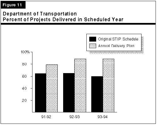 Delivery Against STIP Schedule. Figure 11 illustrates Caltrans' degree of success in delivering projects in the year in which they were scheduled. As the figure illustrates, in 1993-94 Caltrans delivered 60 percent of projects that had originally been scheduled in the STIP for 1993-94 delivery; this is a slight decline from 65 percent delivery in 1991-92 and 1992-93. Projects that are not delivered in their originally scheduled year may have been delivered early or may be delayed for late delivery.