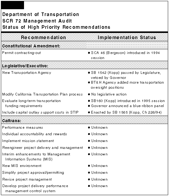 Implementation Moving Slowly. Figure 12 shows the 14 high- priority recommendations and the progress to date. While the Legislature has not formally ratified the report's recommendations, it has considered legislation to implement some components. At present, however, only one recommendation--include capital outlay support costs in the STIP--has been enacted into law.
