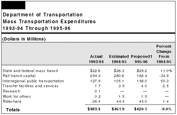 For 1995-96, the Mass Transportation program will account for approximately 6.8 percent of the department's total expenditures. The budget proposes $420.1 million in program expenditures, which is $41.8 million (9 percent) less than estimated current-year expenditures.