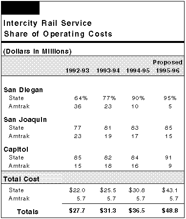 The budget requests $43.1 million in 1995-96 to support intercity rail operating expenditures. The amount includes $28.8 million to fund existing services and $14.3 million requested to expand service as follows: