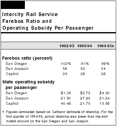 Subsidy Per Passenger Ranges Widely. Depending on the operating costs charged by Amtrak, total ridership and passenger fares, the state's operating cost (subsidy) per passenger for each route varies. Figure 16 shows the per passenger subsidy from 1992-93 to 1994-95. As the figure shows, subsidy per passenger may increase even when service on a route achieves a higher farebox ratio. For instance, per passenger subsidy for the San Diegan would increase to $4.30 in 1994-95 despite a projected higher farebox ratio than in 1993-94. Additionally, even though the San Joaquin achieves a higher farebox ratio than the Capitol, subsidy per passenger for the San Joaquin in the past two years has been significantly higher.