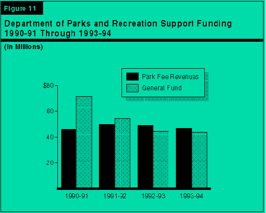 Department's General Fund Support Has Fallen. Between 1990-91 and 1995-96, General Fund support for the department fell from $70.9 million to $48 million, a decrease of about $22.9 million (or 32 percent). This decrease in General Fund support has left the department increasingly reliant on the SPRF and other funds for its support. As a consequence, in the past few years, the department has increased beach and park service fees in the hopes of increasing revenues to the SPRF. Despite that, our review shows that revenues from these fees have remained relatively flat over recent years. Figure 11 shows that annual beach and park service fee revenues peaked in 1991-92 at about $50 million, and declined slightly in 1992-93 and 1993-94.