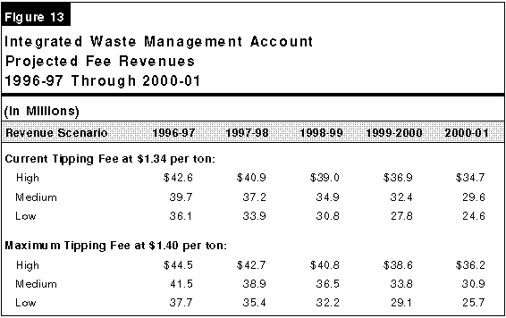 At the current fee level, total revenues could decline by $5.1 million (high scenario) to $11.6 million (low scenario) between 1995-96 and 1996-97. Figure 13 also shows that between 1995-96 and 2000-01, revenues are projected to decline by $11.5 million (24 percent) under the high revenue scenario with a $1.40 per ton tipping fee surcharge and by $23.1 million (48 percent) under the low revenue scenario with the current $1.34 per ton surcharge. The percentage reductions in the real purchasing power of the account would be even greater, when adjusted for inflation.