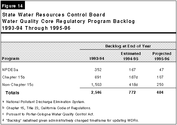 Figure 14 shows the extent of the backlog in the core water quality program in 1993-94, and as anticipated for the current and budget years. As this figure shows, the board anticipates that backlogs will be reduced in the current year. The board anticipates this current-year reduction as a result of both the implementation of the administrative initiatives in its four-year plan to reduce backlogs (discussed below) and its recent decision to change the time schedule for updating waste discharge requirements. Formerly, the board had updated WDRs every three, five, or ten years, based on the relative threat to water quality of a particular discharge of waste. For 1994-95 and future years, the board has revised this update schedule--an administrative goal that is not required by statute--to every 5, 10, or 15 years. The significant decrease in backlogs in the update of WDRs between 1993-94 and 1994-95 reflects this scheduling change which thereby redefines a "backlog." The board has stated that a WDR will be reviewed and updated if the threat to water quality so dictates, regardless of the schedule for updates.