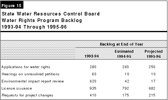 Backlogs Throughout Water Rights Program. As discussed in the Analysis of the 1994-95 Budget Bill (page B-65), significant backlogs have developed over the last several years in all areas of the board's water rights program. Backlogs have resulted from the increasingly complex environmental reviews of water diversions and increasing complaints, while funding has remained relatively stable. Figure 15 shows the extent of the backlog in the water rights program in 1993-94, and as anticipated for the current and budget years.