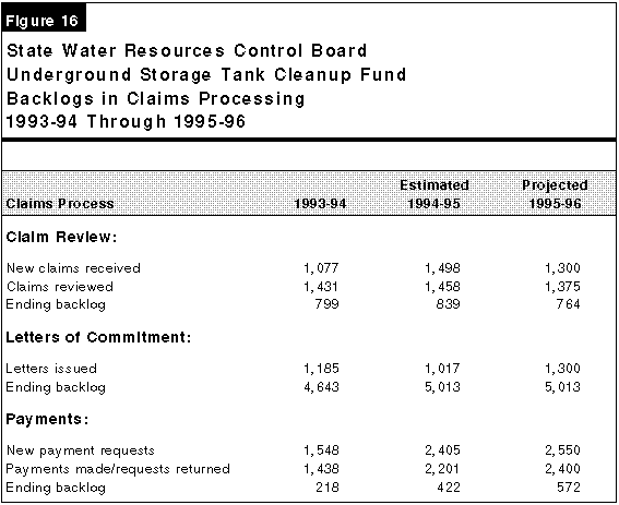 The board's program which reimburses owners of leaking underground storage tanks for cleanup costs has significant backlogs in the administration of claims, particularly in the issuance of letters of commitment. We recommend that the board report, at budget hearings, on how the budget's proposal to increase staffing for this program by 19.5 personnel-years in 1995-96 addresses this backlog problem.