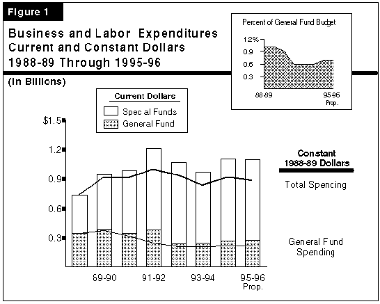 Figure 1 shows that expenditures for business and labor programs from all state funds reached a peak of about $1.1 billion in 1991-92, then declined slightly through 1993-94 and are projected to approach the previous peak level in 1995-96. Over the eight-year period shown in Figure 1, expenditures increased by $366 million, representing an annual average growth of 5.9 percent. When these expenditures are adjusted for inflation, total spending since 1988-89 has increased by an average of 2.6 percent annually. The General Fund share of program expenditures has declined from 47 percent in 1988-89 to 25 percent in the budget year. General Fund expenditures for the budget year, however, represent a slight increase compared to the current year.