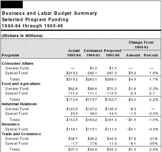 The budget proposes total state expenditures of $1.1 billion for business and labor programs in 1995-96. This level of spending is a decrease of $6.9 million, or 0.6 percent, from estimated current- year expenditures.