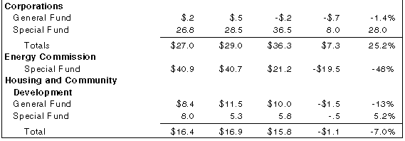 The figure also shows proposals for several departments to decrease their expenditures for certain programs. For example, the figure shows a $19.5 million overall decrease in the Energy Commission's proposed expenditures. This reduction reflects the administration's proposal to provide only half-year funding for the commission and transfer its functions to a new Department of Energy and Conservation. The figure also shows a $4.4 million unallocated reduction in the Department of Insurance to address a revenue shortfall and a $1.5 million reduction to the Department of Housing and Community Development for reduced workload in housing programs.
